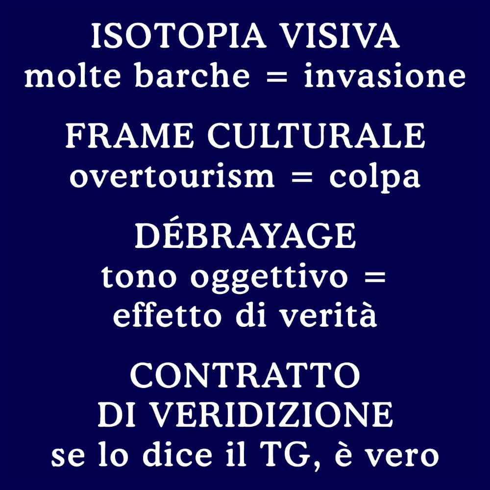 L’analisi mette inoltre in luce come l’accumulo visivo di imbarcazioni attivi specifiche isotopie —in questo caso quella dell’«invasione»— rafforzate da frame culturali contemporanei come quello dell’overtourism, contribuendo a generare una lettura emotiva e semplificata del fenomeno.
